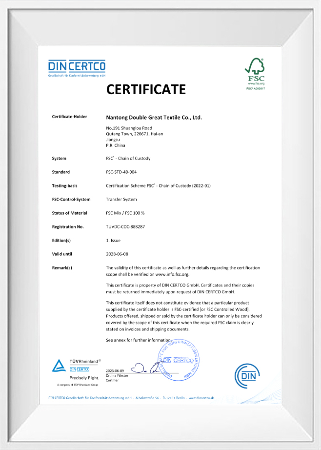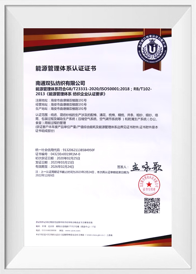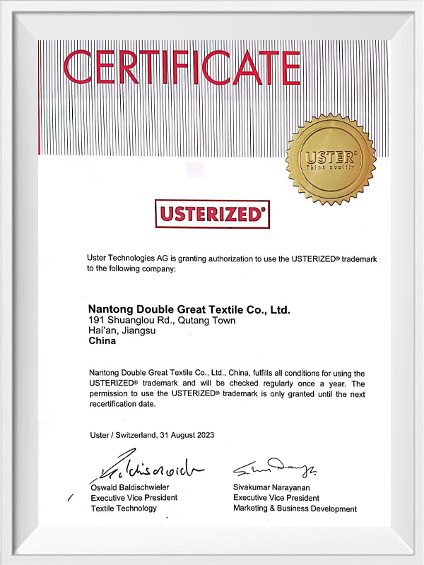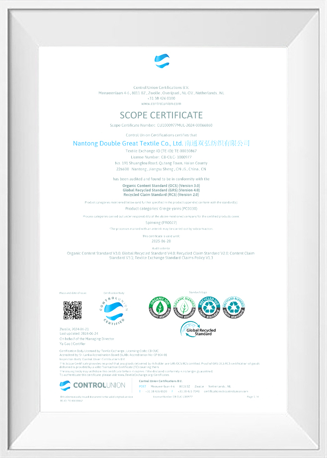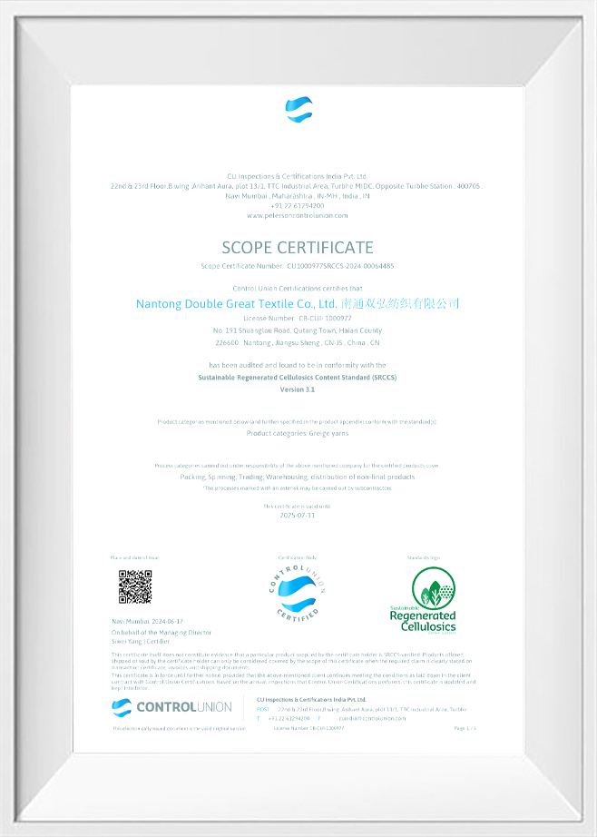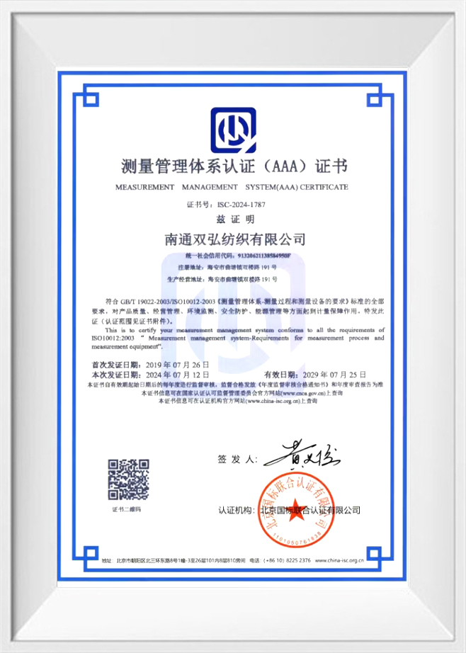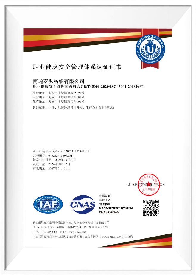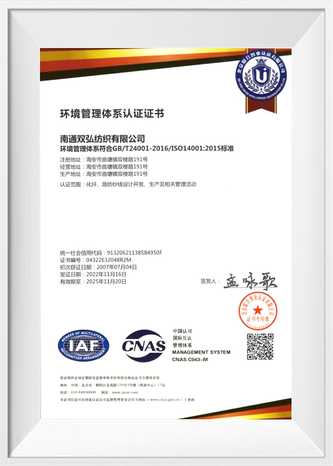 Kvalita a ochrana životního prostředí jsou naše závazky vůči našim zákazníkům. Za tímto účelem jsme získali řadu autoritativních osvědčení, abychom zajistili kvalitu a ochranu životního prostředí každé dávky produktů. Naše příze šetrné k životnímu prostředí prošly přísným testováním a certifikací, včetně systému Environmental Management ISO 14001, profesionálního testování a certifikace antibakteriálních a antistatických přízí atd. To nejen ověřuje naši inovační schopnost, ale také odráží náš závazek k vysoce standardní ekologické výrobě. .