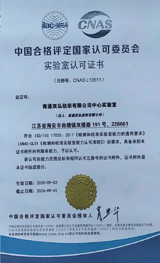 V poslední době Ústřední laboratoř společnosti Nantong Double Great Textile Co., Ltd. úspěšně získala akreditaci z čínské akreditační služby pro posouzení shody (CNA) a získal certifikát. Toto je další cenná kvalifikace, kterou laboratoř získala poté, co se stala platformou pro testování příze Čínské bavlněné textilní asociace. Centrální laboratoř Double Great Company se také stala jednou z pokročilých laboratoří vynikajících bavlněných rotujících podniků v zemi.