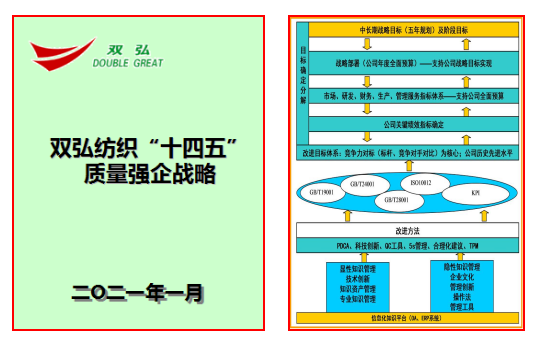 Kvalita je životnost podniku. Jako senior společnosti soudruh Ji Yijun vždy považoval zlepšení kvality za nejvyšší prioritu společnosti déle než 40 let. Pod jeho lodí a vlivem, Double Great Company zavedla a implementovala model správy excelence výkonu od roku 2007, čímž vytvořila poslání „Každá příze je hodnota slunečního svitu“, základní hodnoty „inovace, kvality, integrity a harmonie“ a vizi „životnosti života, vždycky dvojnásobné velké“. The refined quality management slogan "No matter how small the quality is, it is a big deal, no matter how difficult the quality is, it must be done well, and employees who do not pay attention to quality are not good employees" has been incorporated into the company's quality aphorisms, and the quality work motto "Quality will have a market" has become a quality concept known to everyone in the company, and has been promoted and disseminated to the entire industry through an exclusive interview with China Textile News.