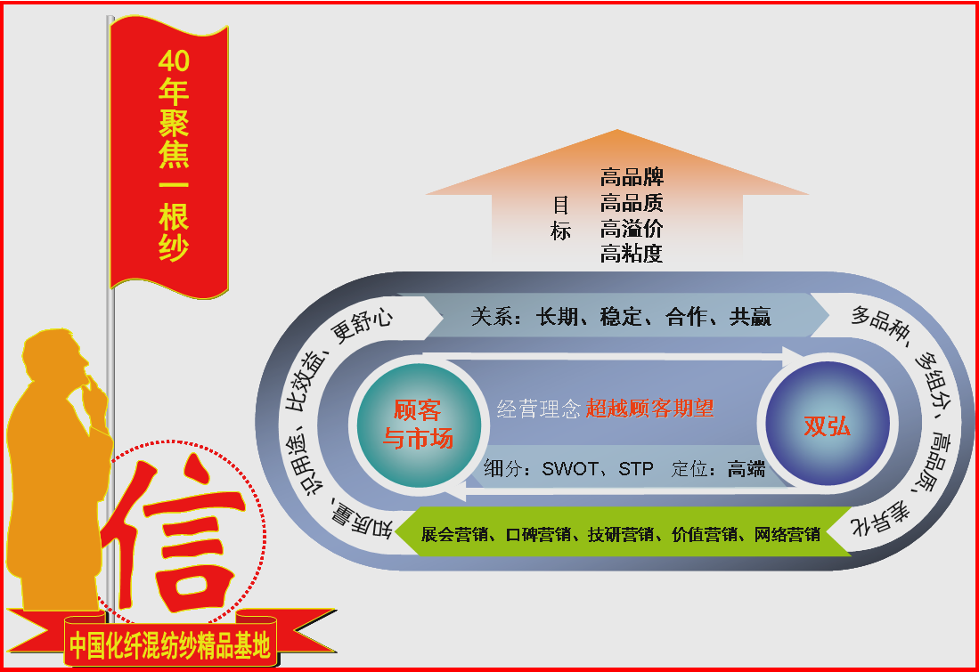 Zaměření na zákazníky a zlepšování značek jsou ve své práci rozhodné požadavky a pevné pronásledování soudruha Ji Yijuna. Under his advocacy, the company has formulated the business philosophy of "using the rigorous management, spinning the quality yarn, and climbing the -end customers", with "high brand, high quality, high premium, and high stickiness" as the goal, using "SWOT, STP" and other tools to investigate and segment the market, lock in key customer groups, adopt a "small batch, multiple varieties, fast delivery, high quality" fast marketing strategy, implement "exhibition marketing, word-of-mouth marketing, technical research marketing, knowledge marketing, value marketing, network marketing" and other methods, and use the "30 Articles of Double Great Service Guidelines" to let customers "know the quality, recognize the purpose, compare benefits, fast delivery, and more comfortable", establish a "long-term, stable, cooperative, and win-win" customer relationship, and form a highly competitive Double Great marketing model to win and maintain customer satisfaction and loyalty and achieve the common development of customers and Double Great.