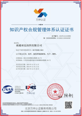 Certifikace systému řízení dodržování předpisů duševního vlastnictví je aktivitou hodnocení shody, ve které certifikační orgán třetích stran vyhodnocuje interní systém řízení duševního vlastnictví podniku, aby potvrdil, že splňuje požadavky příslušných národních standardů nebo technických specifikací. V současné době má společnost Double Great Company 5 domácích ochranných známek a 2 ochranné známky registrovaných Madrid International. Dvojitá skvělá ochranná známka je známá ochranná známka v Číně; Má více než 50 patentů na národní vynález a patenty na modely užitkových modelů a získal cenu patentového zlatého průmyslu v čínském textilním průmyslu; provedla 4 národní pochodeň a 5 projektů Spark Plan; Vytvořila 3 národní standardy, 11 průmyslových standardů, 4 skupinové standardy a 3 standardy spotřeby obchodních jednotek; Provedla průmyslovou a univerzitní výzkum a 5 klíčových technologií a vědeckých a technologických projektů získalo druhou cenu čínského textilního průmyslu vědy a technologického pokroku.