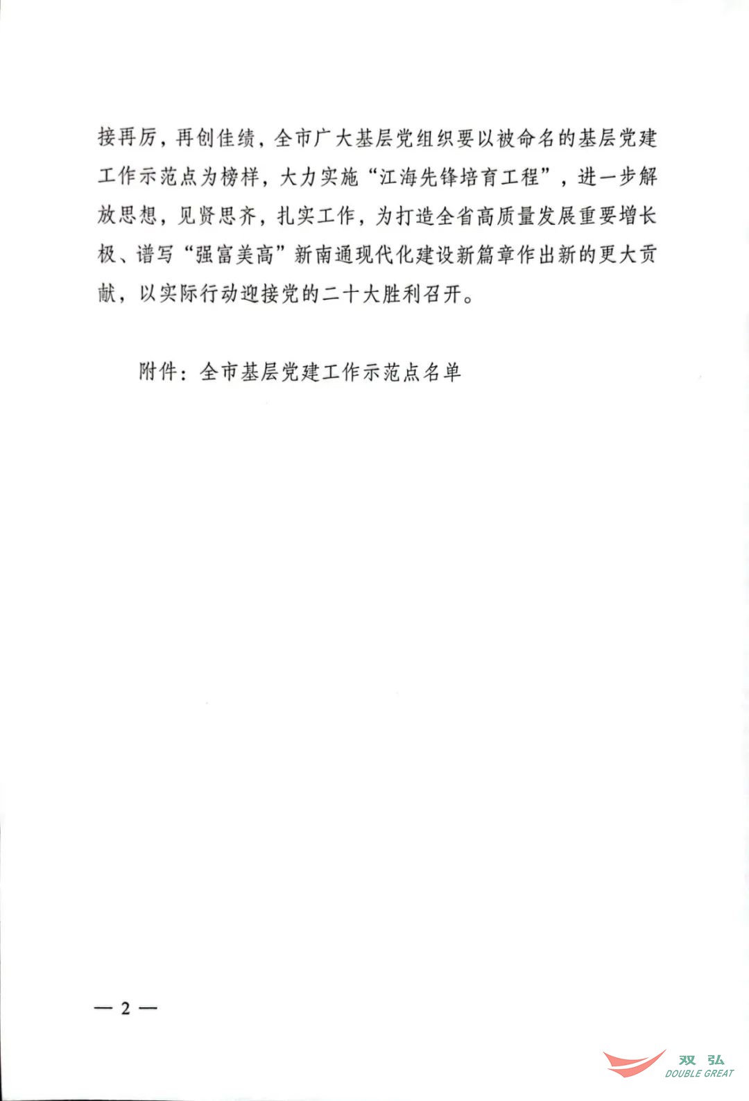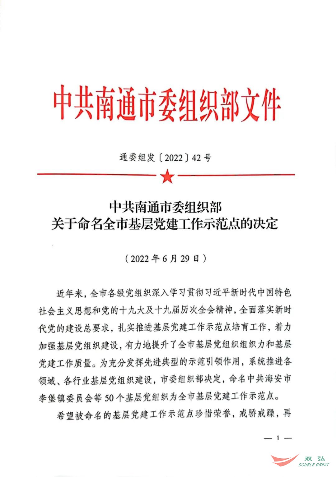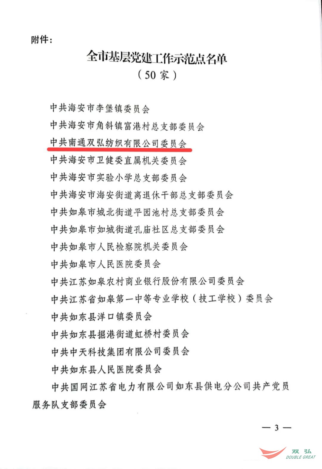 Nedávno organizační oddělení městského výboru CPC Nantong vydalo dokument, který pojmenoval 50 organizací stran na místní úrovni jako demonstrační místa pro budování stran města. Stranický výbor Nantong Double Great Textile Co., Ltd. získal titul „městské demonstrační stránky pro budovu na místní straně“.