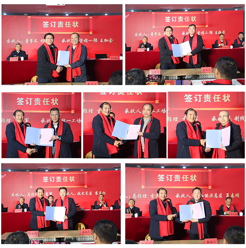 At the meeting, the head of the marketing department signed a marketing target responsibility letter with Chairman Yang Yang, and the heads of the production workshop, technology, equipment and other departments signed production task and key work target responsibility letters with General Manager Ji Yijun respectively.
